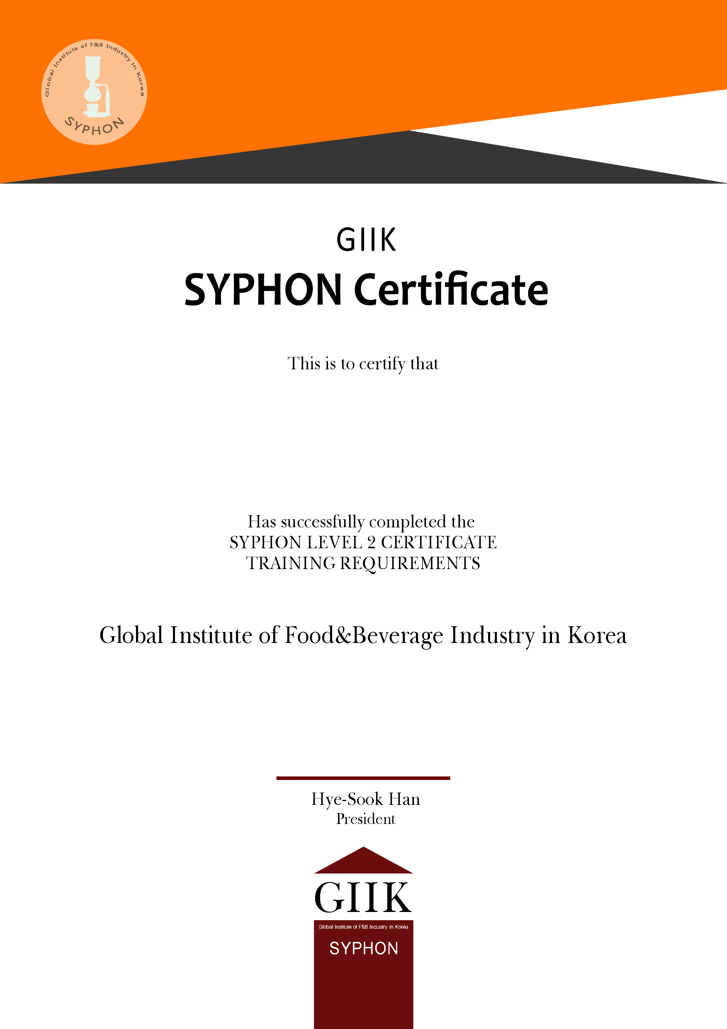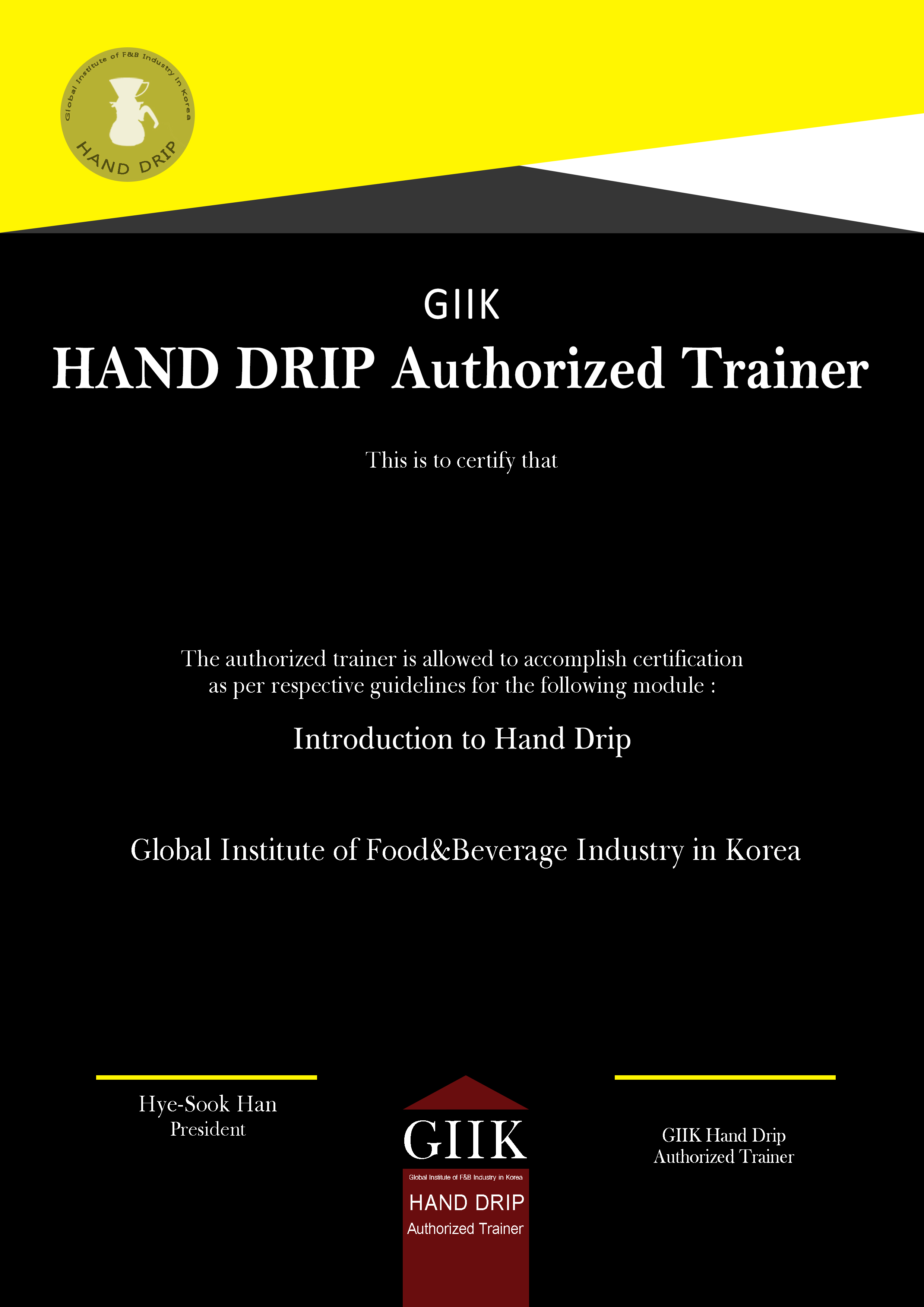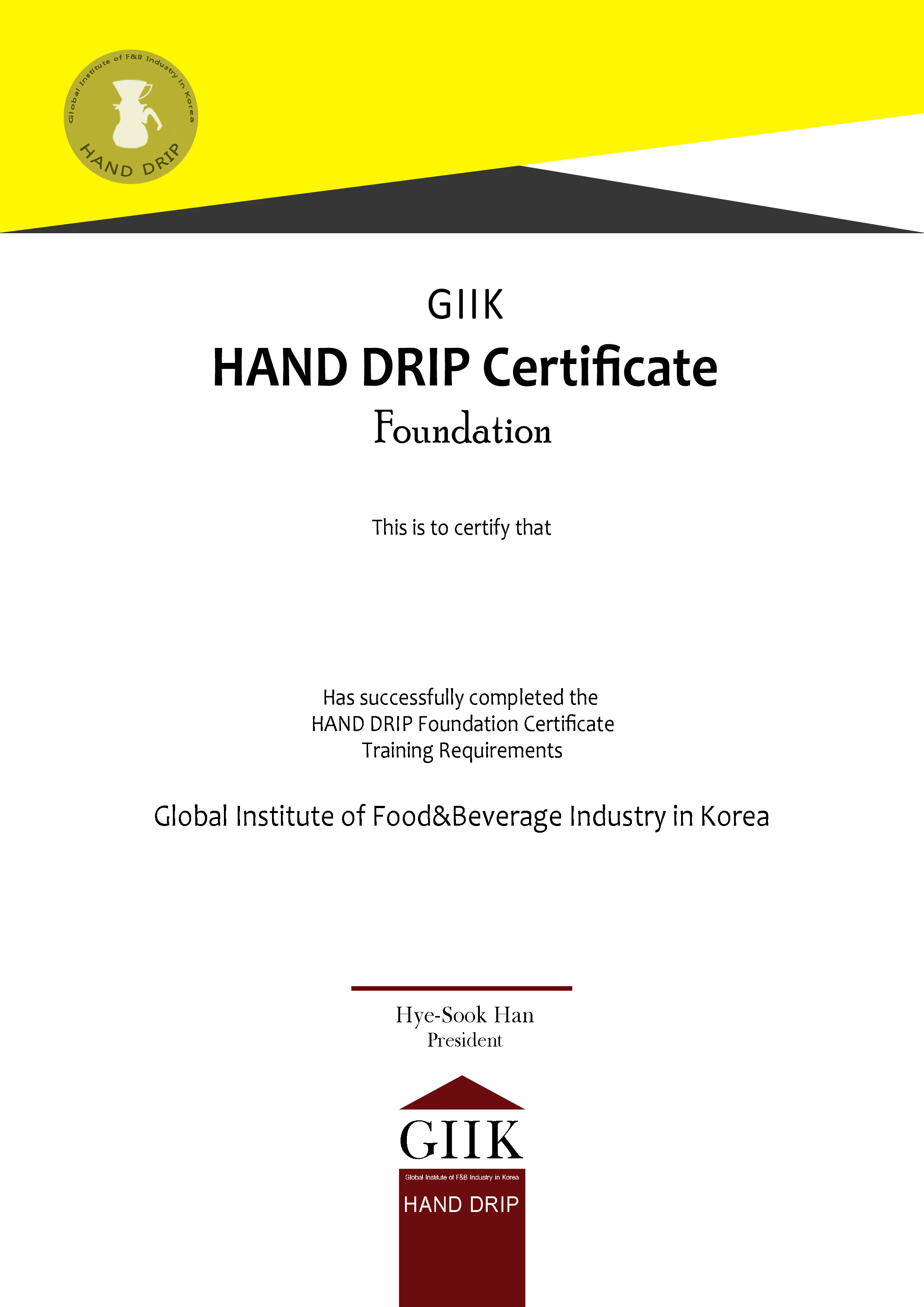Non Alcohol [Coffee]바리스타 1급커피에 대한 기본 이론 및 바리스타 실무 테크닉을 평가Certificate핸드드립 파운데이션핸드드립 커피에 대한 기본 추출 원리 및 추출 테크닉을 평가Certificate핸드드립 1급핸드드립 커피에 대한 기구별 추출 원리 및 그에 따른 추출 테크닉을 평가Certificate라떼아트 1급라떼아트 푸어링 기법에 따른 실무 이해 및 디자인별 푸어링 테크닉을 평가Certificate로스팅 1급생두부터 로스팅 테크닉에 대한 전문적 지식 및 로스팅 테크닉을 평가Certificate사이폰 1급브루잉 커피에 대한 전문적 지식 및 사이폰 기구별 추출 테크닉을 평가CertificateAlcohol [Sake, Wine etc.]사케 소믈리에 1급사케에 대한 전문적 지식 및 서비스‧프로모션 능력 평가Certificate와인 소믈리에 1급와인에 대한 전문적 지식 및 서비스‧프로모션 능력 평가CertificateAuthorized Trainer바리스타 심사위원바리스타 양성을 위한 프로패셔널 이론지식‧실무능력 평가Certificate핸드드립 심사위원핸드드립 전문가 양성을 위한 프로패셔널 이론지식‧실무능력 평가Certificate라떼아트 심사위원라떼아트 전문가 양성을 위한 프로패셔널 이론지식‧실무능력 평가Certificate로스팅 심사위원로스팅 전문가 양성을 위한 프로패셔널 이론지식‧실무능력 평가Certificate사이폰 심사위원사이폰 전문가 양성을 위한 프로패셔널 이론지식‧실무능력 평가Certificate사케 교육자 자격증(예정)사케 소믈리에 양성을 위한 사케에 관한 전문 교육자 자질 평가와인 교육자 자격증(예정)와인 소믈리에 양성을 위한 와인에 관한 전문 교육자 자질 평가